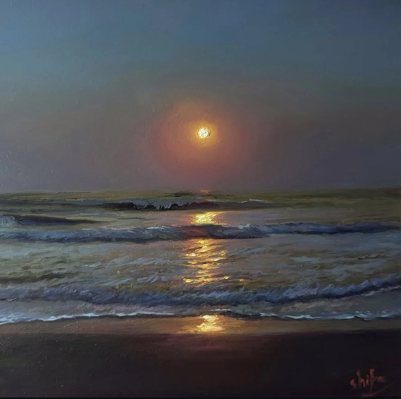 A very special Semi-realistic Sunset seascape. Original oil painting signed by the artist on the front and back.
