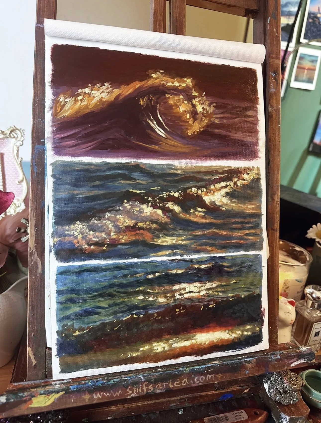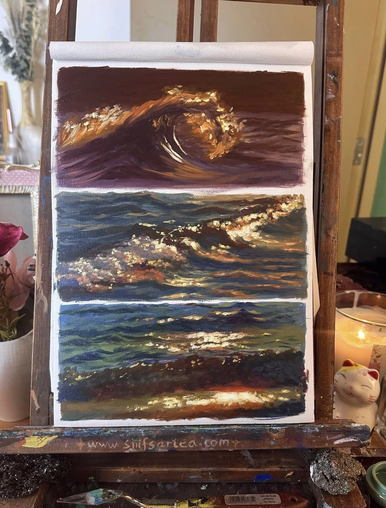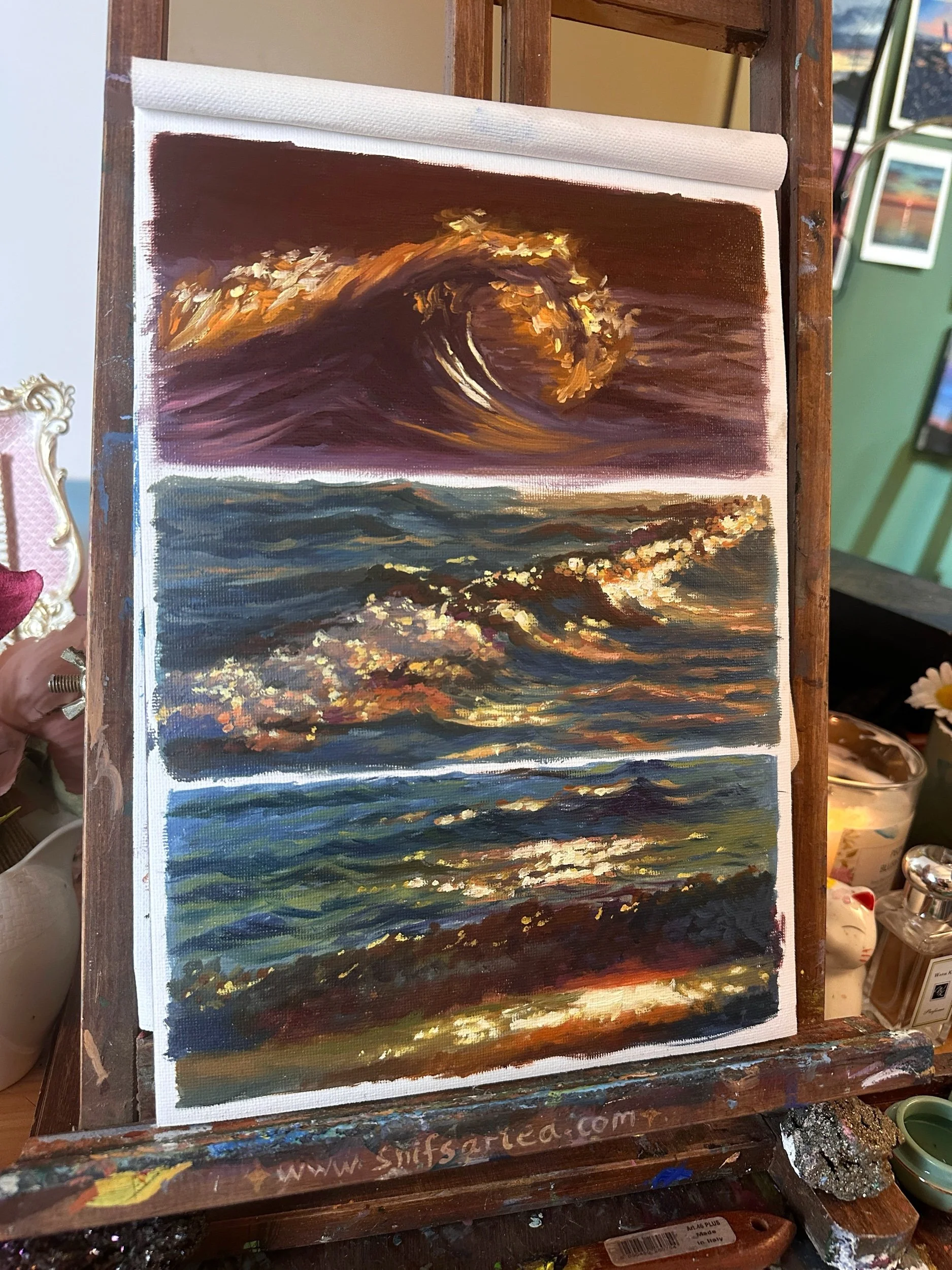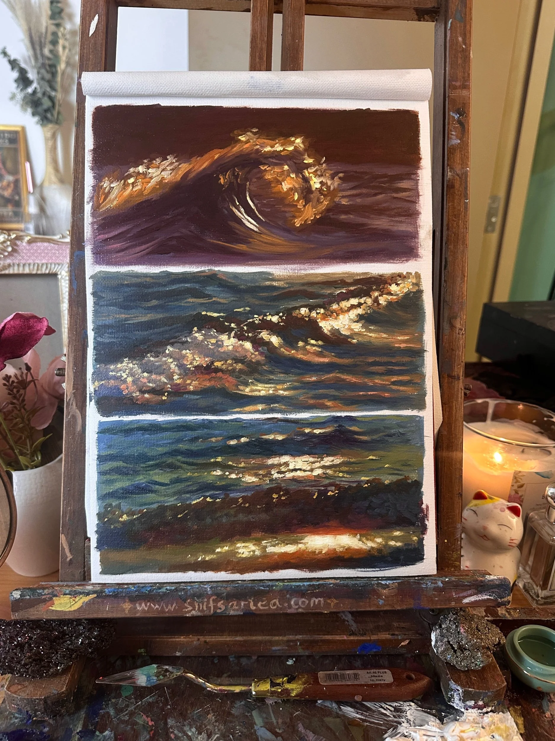 This series of three mini paintings explores the magic of the sea in different moods, from a glowing sunset wave, to shimmering reflections dancing across the surface, to the quiet depth of the ocean kissed by light 🌊
